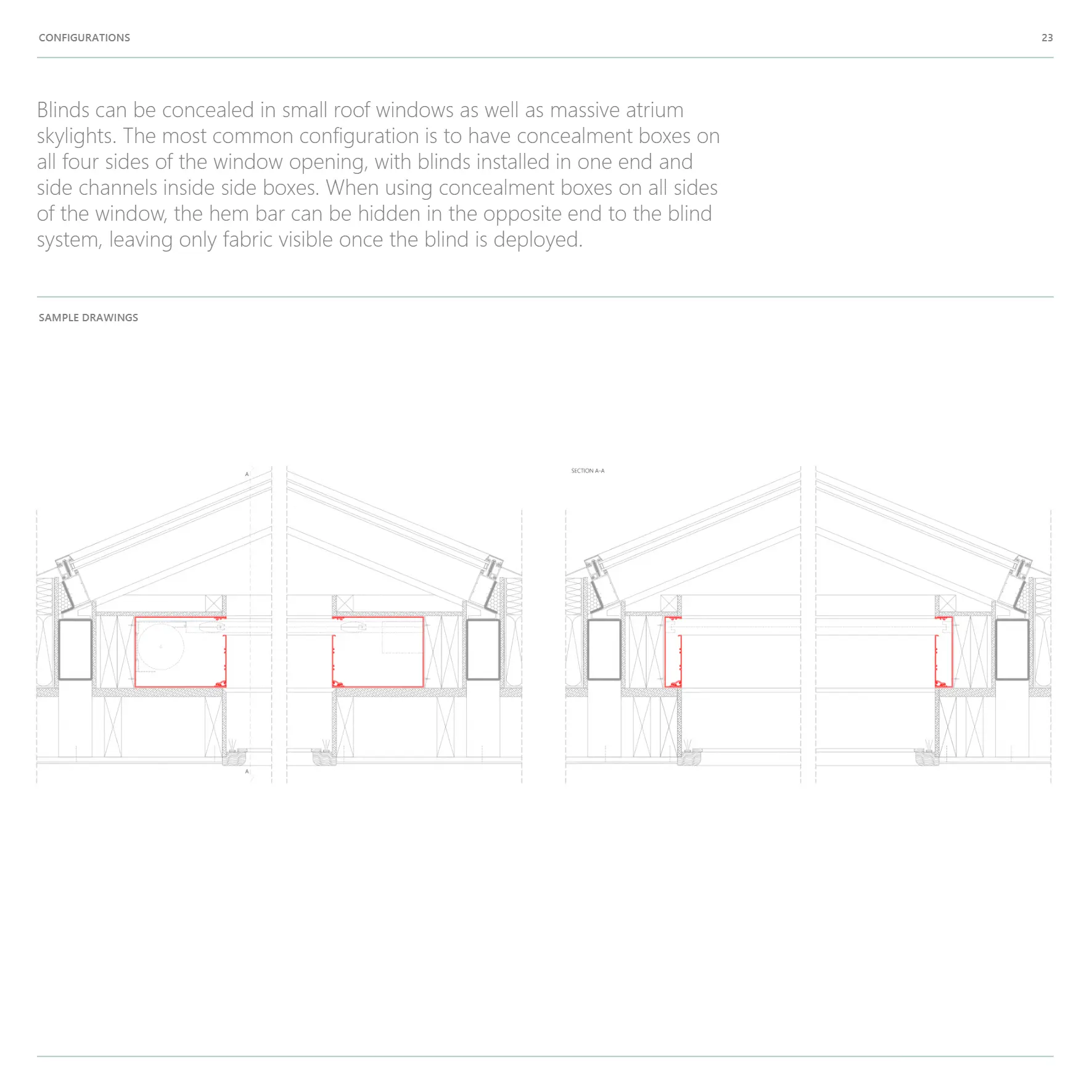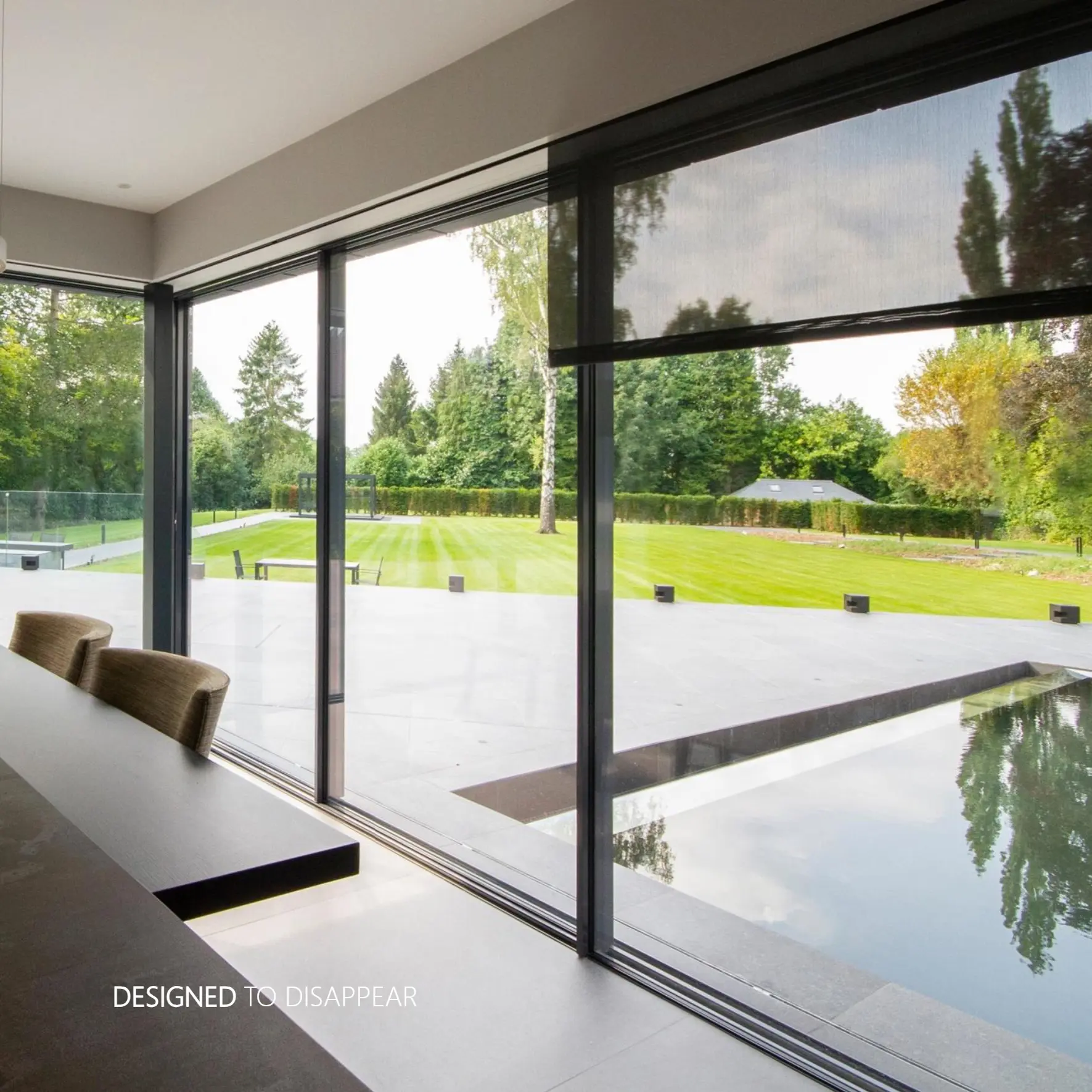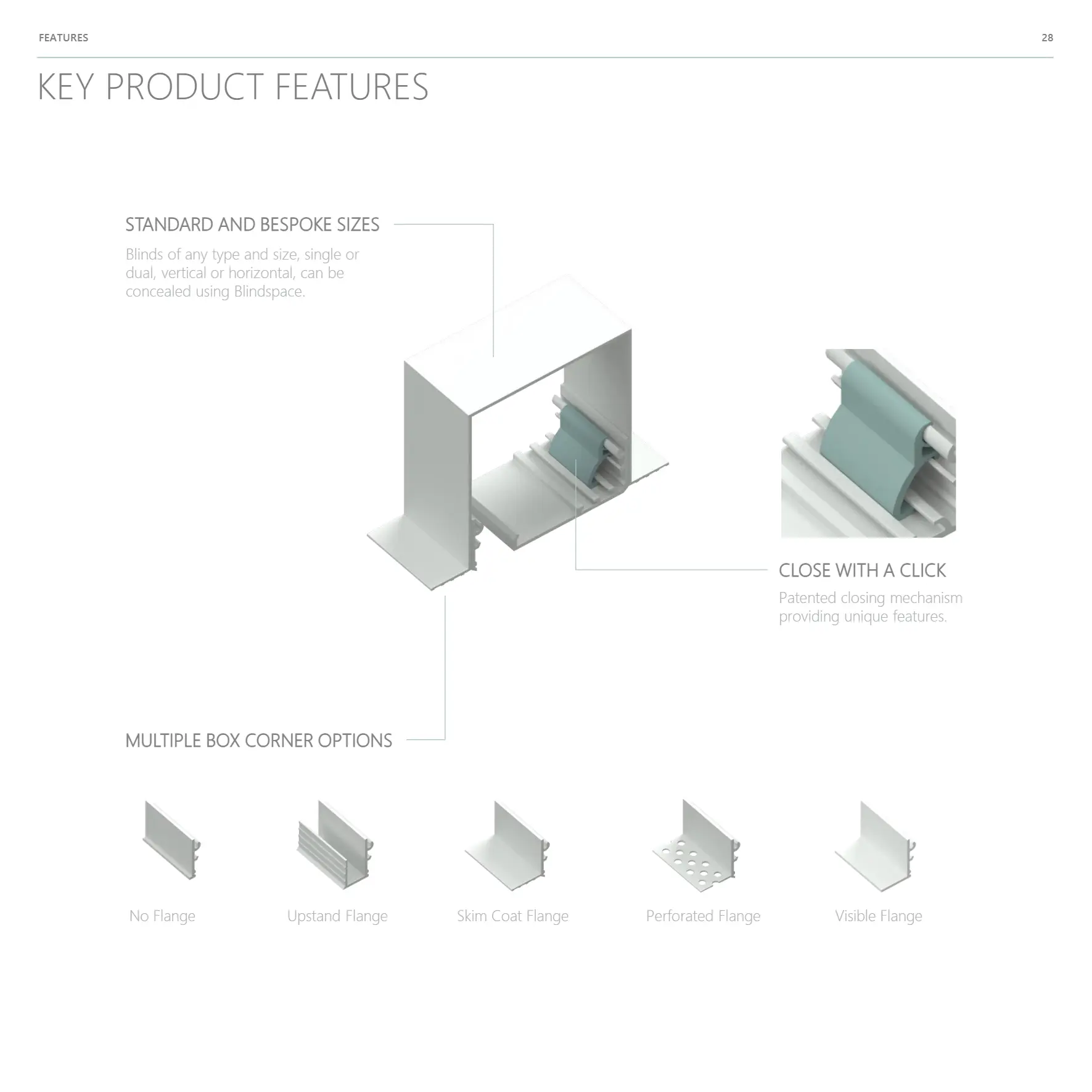 has a unique and patented design where concealed blinds are accessible when required and fully concealed behind an integrated closure panel that simply clicks out and snaps shut. When required, the blind operate through a discrete slot in the wall or ceiling and completely disappear from view when not in use.