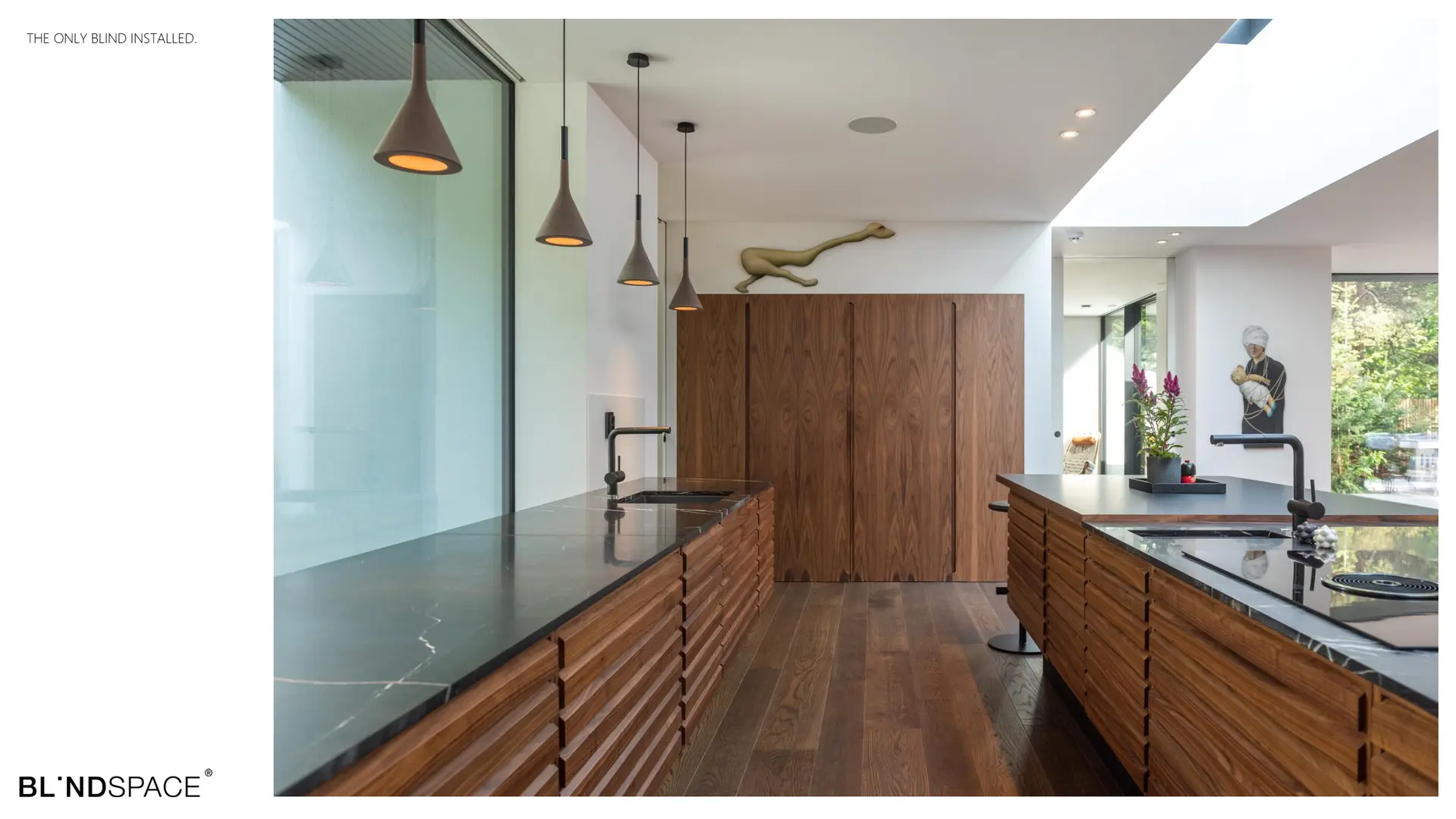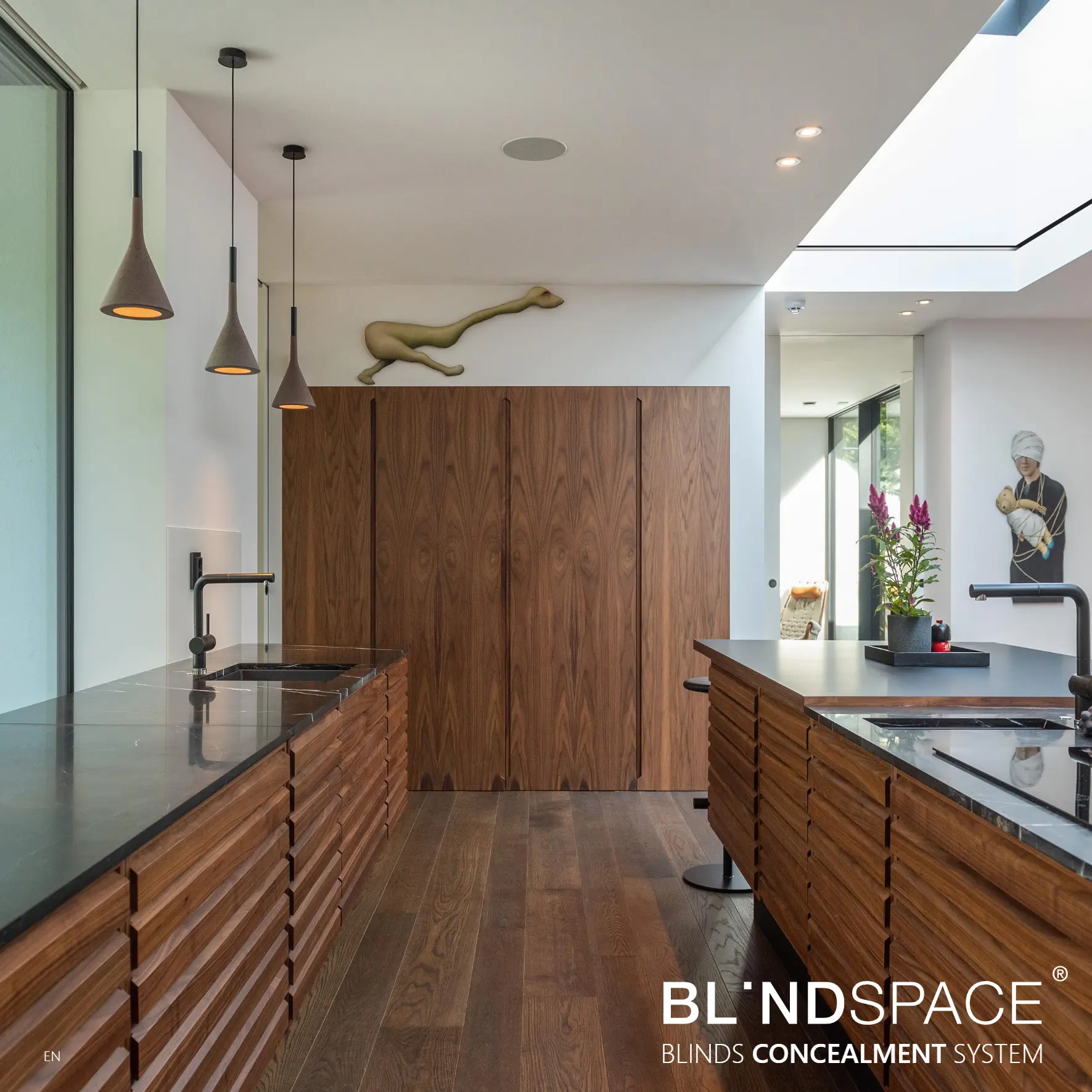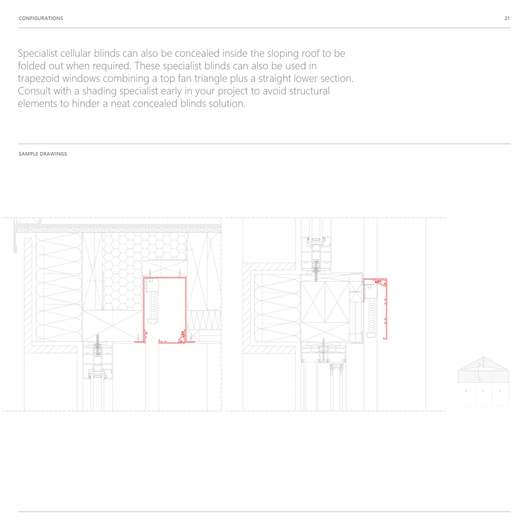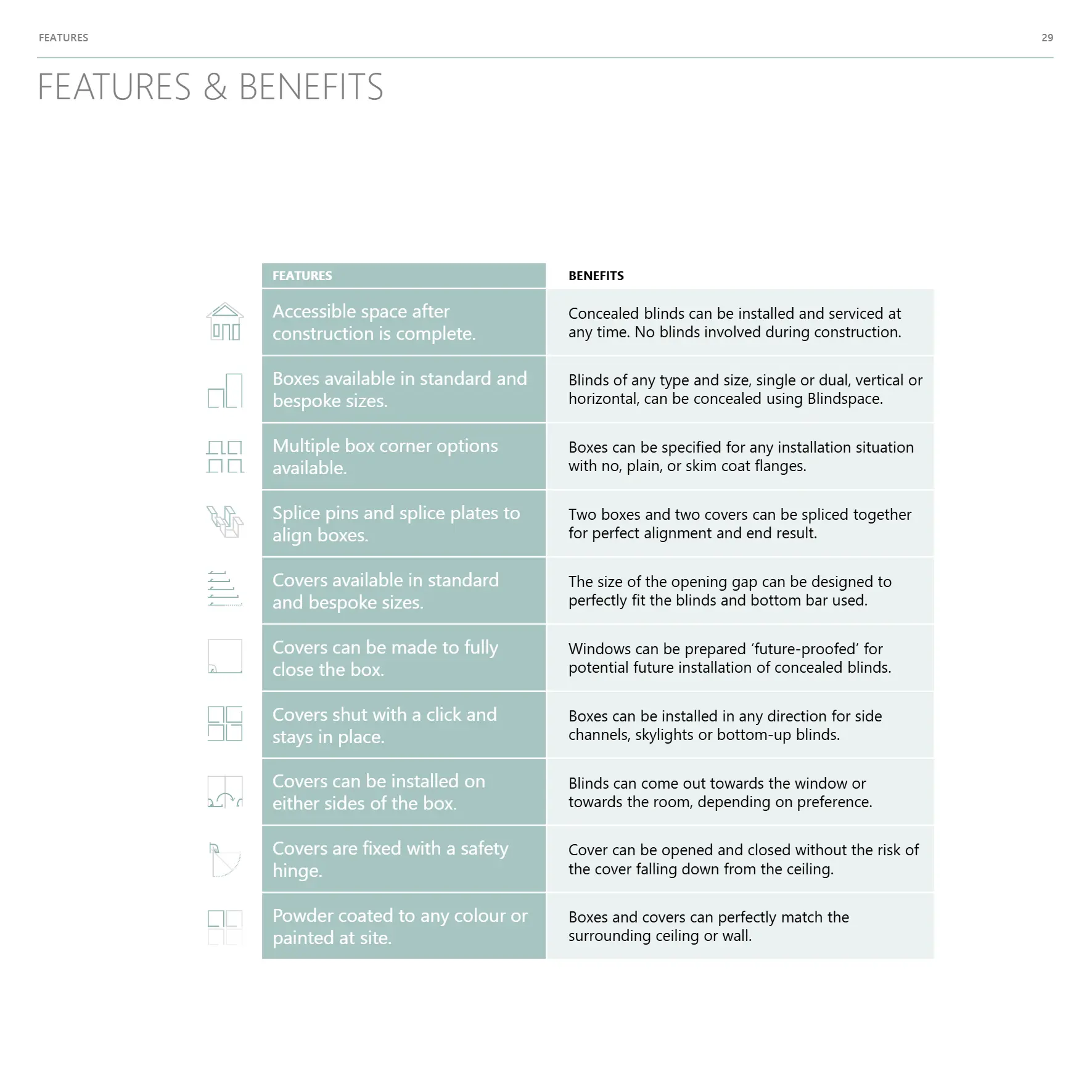 has a unique and patented design where concealed blinds are accessible when required and fully concealed behind an integrated closure panel that simply clicks out and snaps shut. When required, the blind operate through a discrete slot in the wall or ceiling and completely disappear from view when not in use.